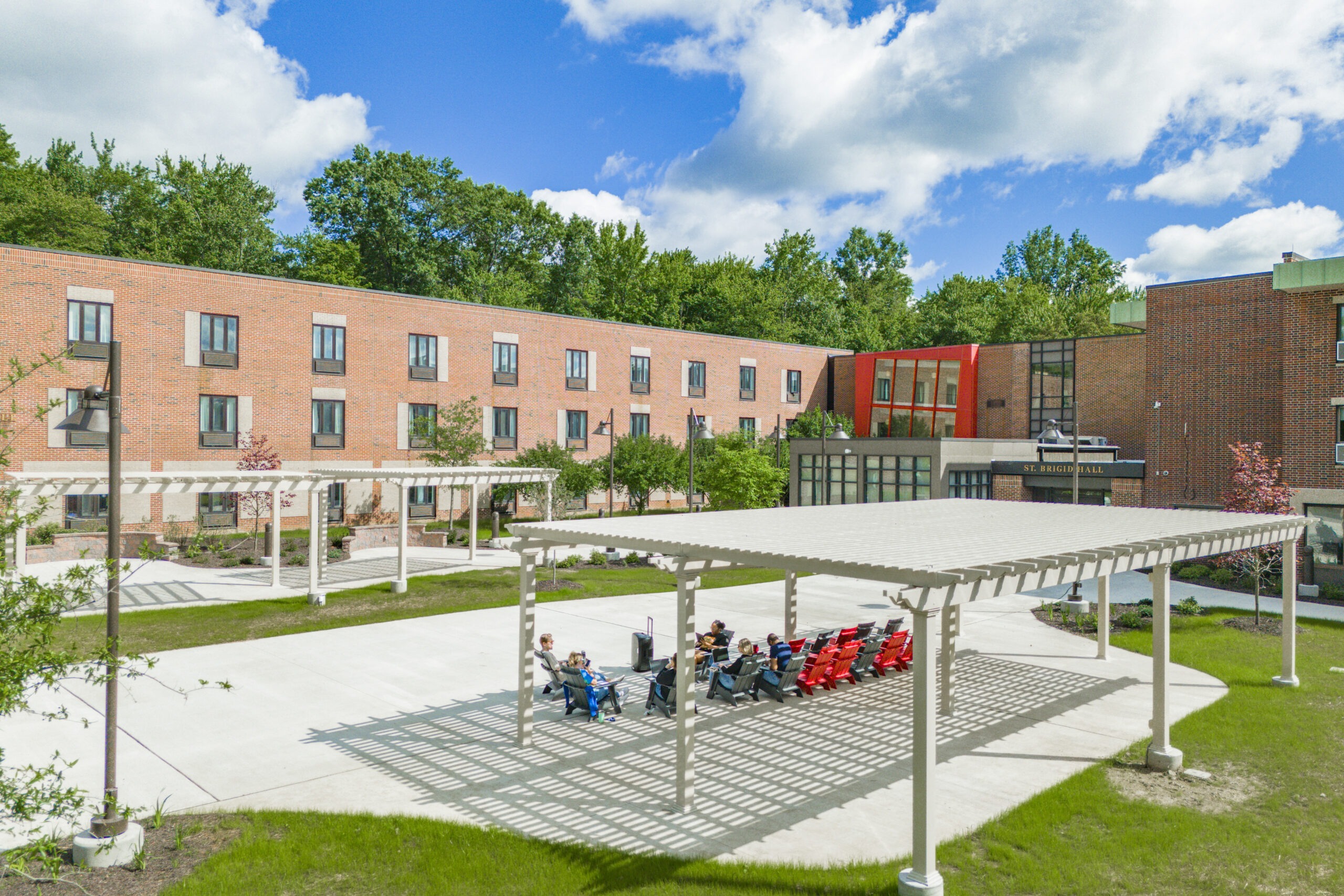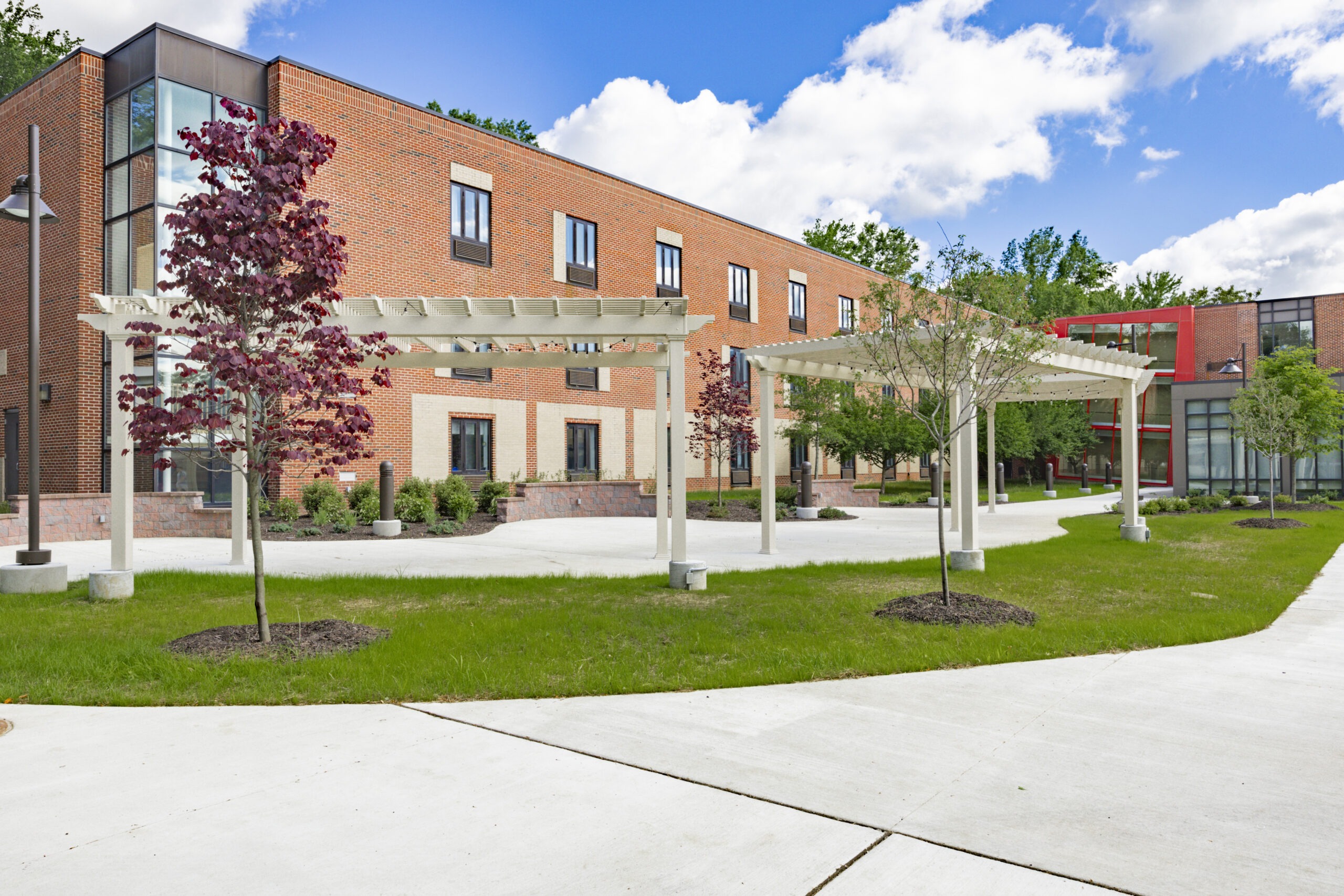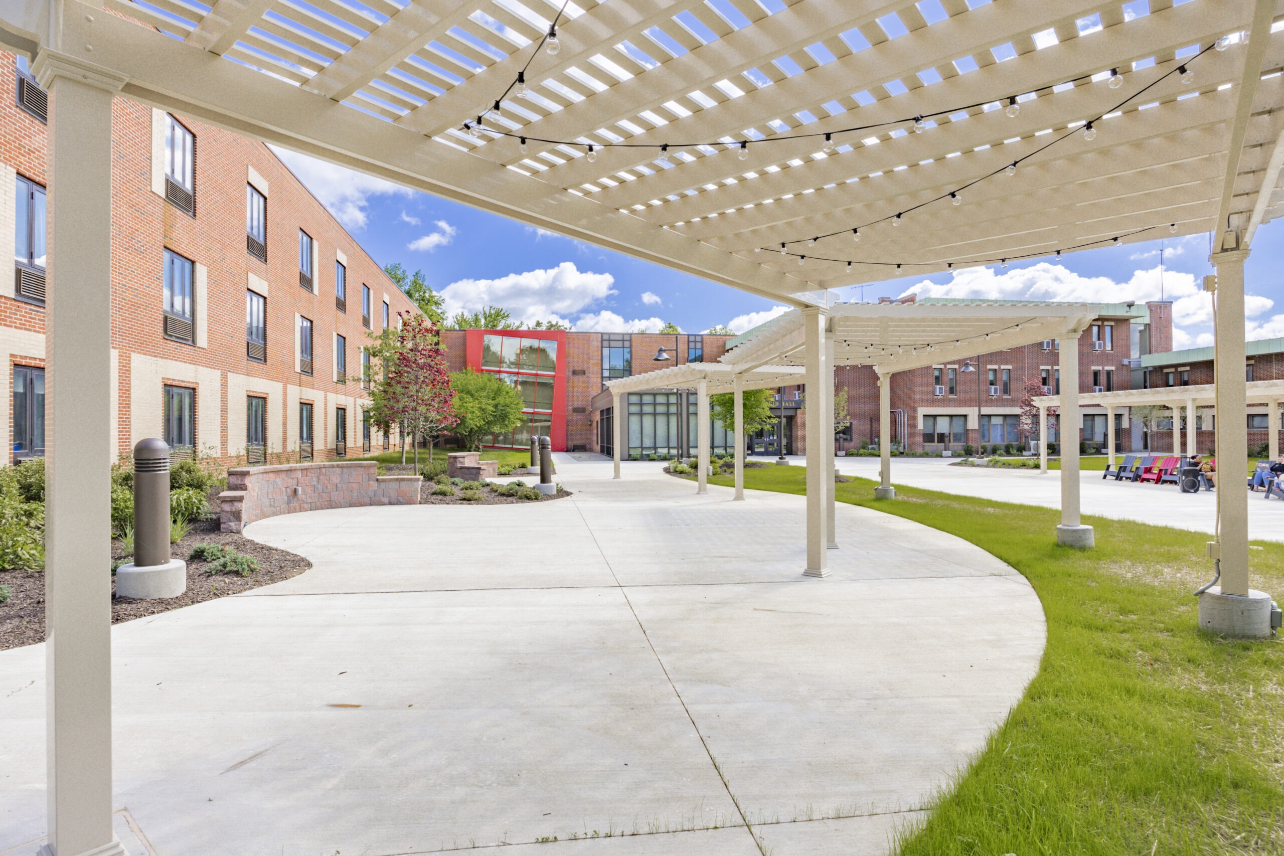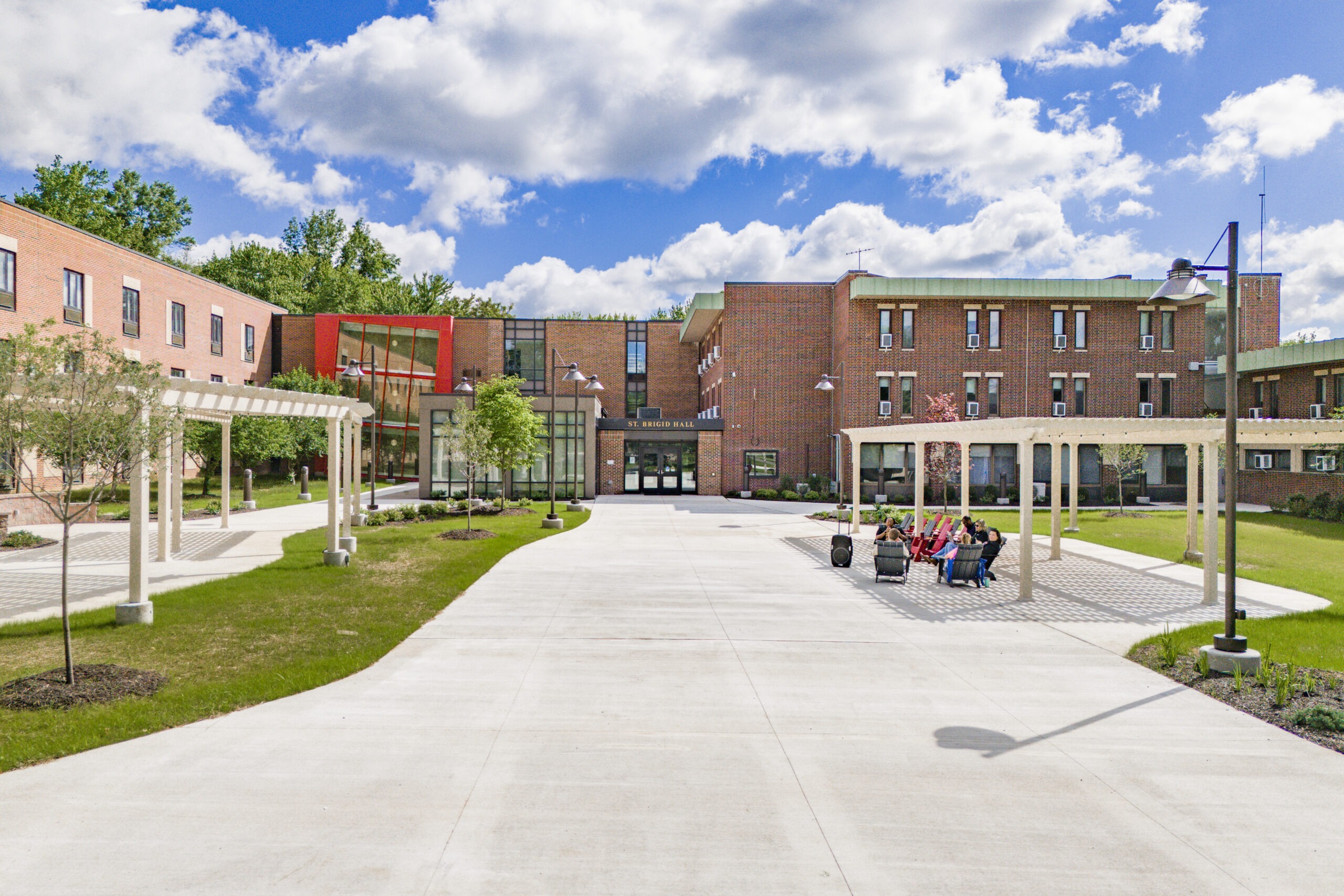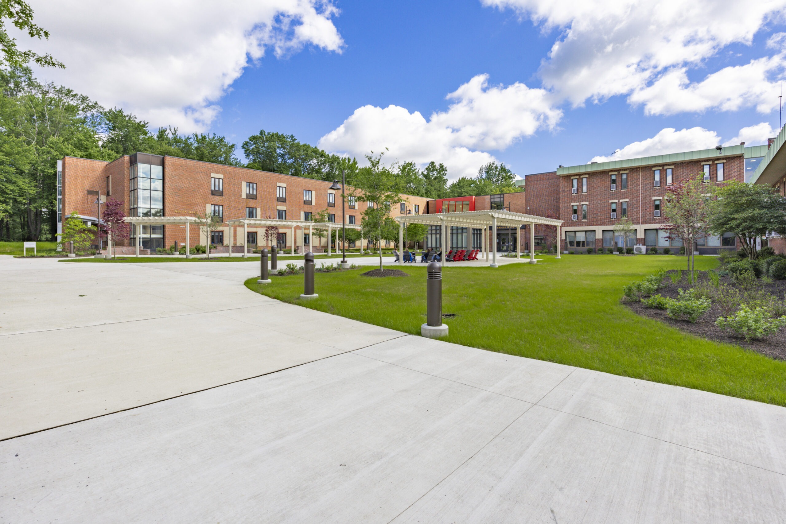 The Triplex Dormitory renovation project at Gwynedd Mercy University involved a comprehensive overhaul of both interior and exterior spaces. Externally, new courtyard areas, site lighting, and landscaping were introduced, while the south entry received concrete work and landscaping enhancements. Internally, air conditioning, new lighting, flooring, paint, and furniture were installed, revitalizing the dormitories and lounge areas. This transformation not only modernized living quarters but also enhanced the overall campus experience, reflecting our commitment to quality and student well-being on GMU’s campus.